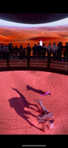 入るとサウジアラビアの紹介パネルのあと、エスカレーターで上に上がる途中にはサウジの戦争や暮らしの映像が、そこには180度の大きなパネルと、階下にも円形にパネルが見えて、それが上手く融合しているのだ。